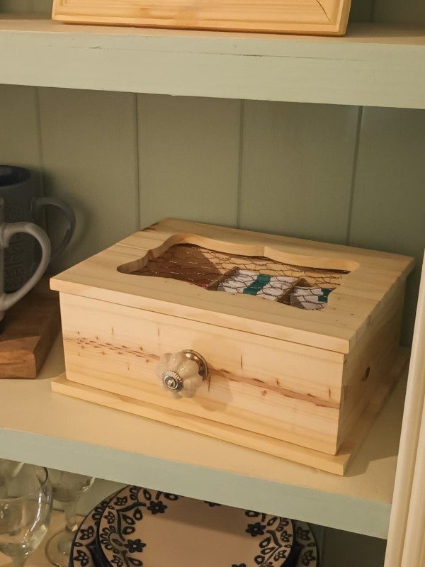 Nuestra Caja de Té Campestre con Cajón está fabricada en madera de pino y combina diseño rústico con practicidad. Su tapa superior con alambre de gallinero permite ver el interior, aportando un estilo decorativo único para la cocina o el rincón del café.
