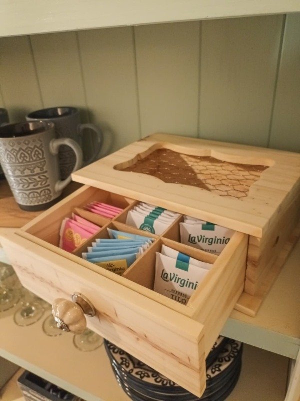 Cuenta con un cajón con tirador decorativo y 6 divisiones internas, ideal para organizar diferentes variedades de sobres de té, infusiones o hierbas.