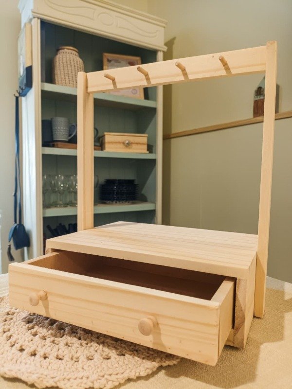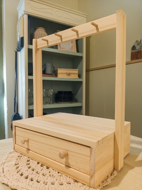 El Organizador “Gajo” está fabricado en madera de pino y combina un pequeño cajón con una barra superior con ganchos, ideal para colgar collares, pulseras y otros accesorios. El cajoncito permite guardar anillos, aros u objetos pequeños, manteniendo todo ordenado en un solo lugar.